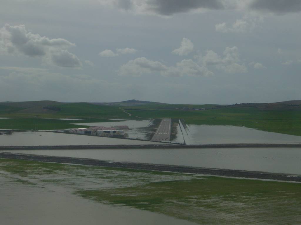 Nachdem wir in Trebujena gestartet sind drehen wir Richtung November und achten auf Flugzeuge, die sich evtl. in unserer Höhe im Anflug auf W des Flughafens Jerez de la Frontera befinden. Sind sie von einer gewissen Flugschule ist davon auszugehen, dass die Insassen ziemlich viel Instrumente im Blick haben, weniger den Luftraum um sie herum. Wir fliegen, nachdem wir N, westlich der Stadt Lebrija, überflogen haben nach Nordosten. Ein wenig über die Reisfelder der Auen des Guadalquivir. Wir fliegen mit unserem UL Richtung Los Palacios y Villafranca, einer kleinen original andalusischen weißen Stadt. Geziert von einer Burg in der Stadtmitte. Wir kommen an der Hacienda de Orán vorbei. Eine Hacienda wie wir sie aus Western des vorigen Jahrhunderts kennen. Neu renoviert, mit Schwimmbad, sehr liebevoll renovierten Zimmern und Apartments. Der Clou ist der offiziell nur 400m lange Flugplatz. In Realität sind es ca. 1000 m gepflegte Graspiste. An der rechten UL-Fläche zieht das Städtchen Utrera vorbei. Auch hier gibt es eine Landepiste, die in keiner Karte verzeichnet ist. Ca. 1000m Sand/ Erde/ Split. Wir halten den Nordostkurs und es folgen große Felder. Im Sommer und Anfang Herbst unbewachsen und beige bis braun und rötlich. Im Winter/ Frühling grün, bzw. mit Sonnenblumen und Getreide bewachsen. Dort mitten drin liegt das UL-Gelände Mairena del Arcor. Ca. 500 m aphaltierte Landebahn. Wir ändern ein klein wenig den Kurs nach links und unterfliegen bei Carmona das ILS von Sevilla entlang der Hangkante. Obenauf, eigentlich neben uns auf der linken Seite Städtchen mit Burg. Carmona ist eine bekannte Stierkampfstadt. Aus der Luft betrachtet scheint sie mit ihren alten Gebäuden/ Burg und Kathedralen auch von der Erde aus eine Reise wert. Es folgt das Flußtal des Guadalquivir, welches wir Richtung Sierra Morena kreuzen. Eigentlich ist der Guadalquivir hier gar kein Fluß mehr, eher ein breiter Bach. Wir fliegen über hügeliges bis bergiges Gelände, eingelagert Talsperren mit glitzerndem blauen Wasser. Das Grün der Umgebung und das Blau des Wassers korrespondieren unter der südlichen Sonne beeindruckend. Man könnte ein Foto nach dem anderen machen, käme dann aber vor lauter fotografieren nicht mehr ans Ziel. Die Landebahn von Fuente Obejuna ist eher unscheinbar an ein Industriegebiet gelegt, ist jedoch 600m lang und besteht aus Asphalt. Die Landebahnausrichtung dieses UL-Geländes ist 11/29. Für eine Erfrischungspause mit essen und trinken zu Fuß gut zu erreichen eine Bar im Industriegebiet.