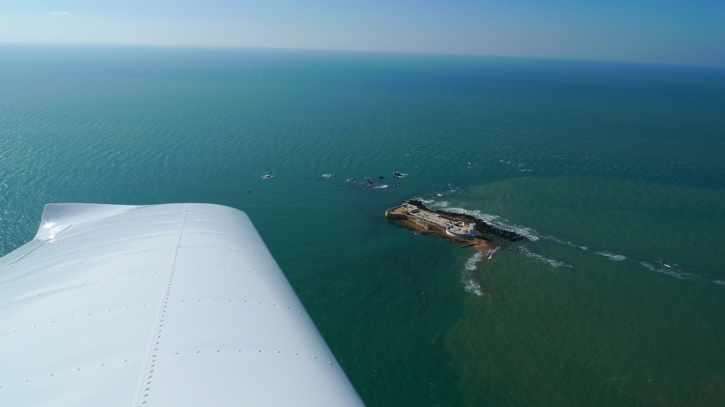 Santi Petri - eine kleine ehemalige Gefänginsinsel im Atlantik vor der Küste von Chiclana de la Frontera. Ein Foto gemacht auf einem Streckenflug mit dem UL von Trebujena, ÜÜUber Rota, Cádiz, Conil de la Frontera, vorbei an Gibraltar über Ronda zück nach Trebujena. Dieser Rundflug mit dem Eurostar aus Trebujena dauert etwas mehr als zwei Stunden.